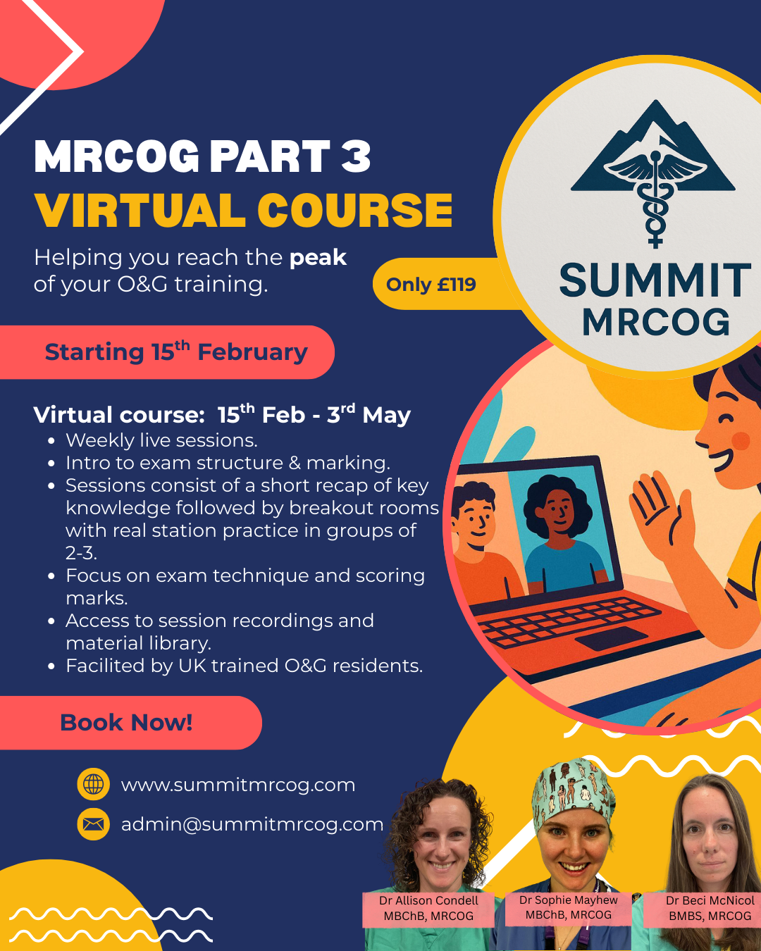 Summit MRCOG is a revision resource made by UK O&G resident doctors, designed to help other doctors attempting Part 2 & Part 3 MRCOG membership exams. We deliver weekly, live tutorials and sessions accross all aspects of the syllabus and reading lists.